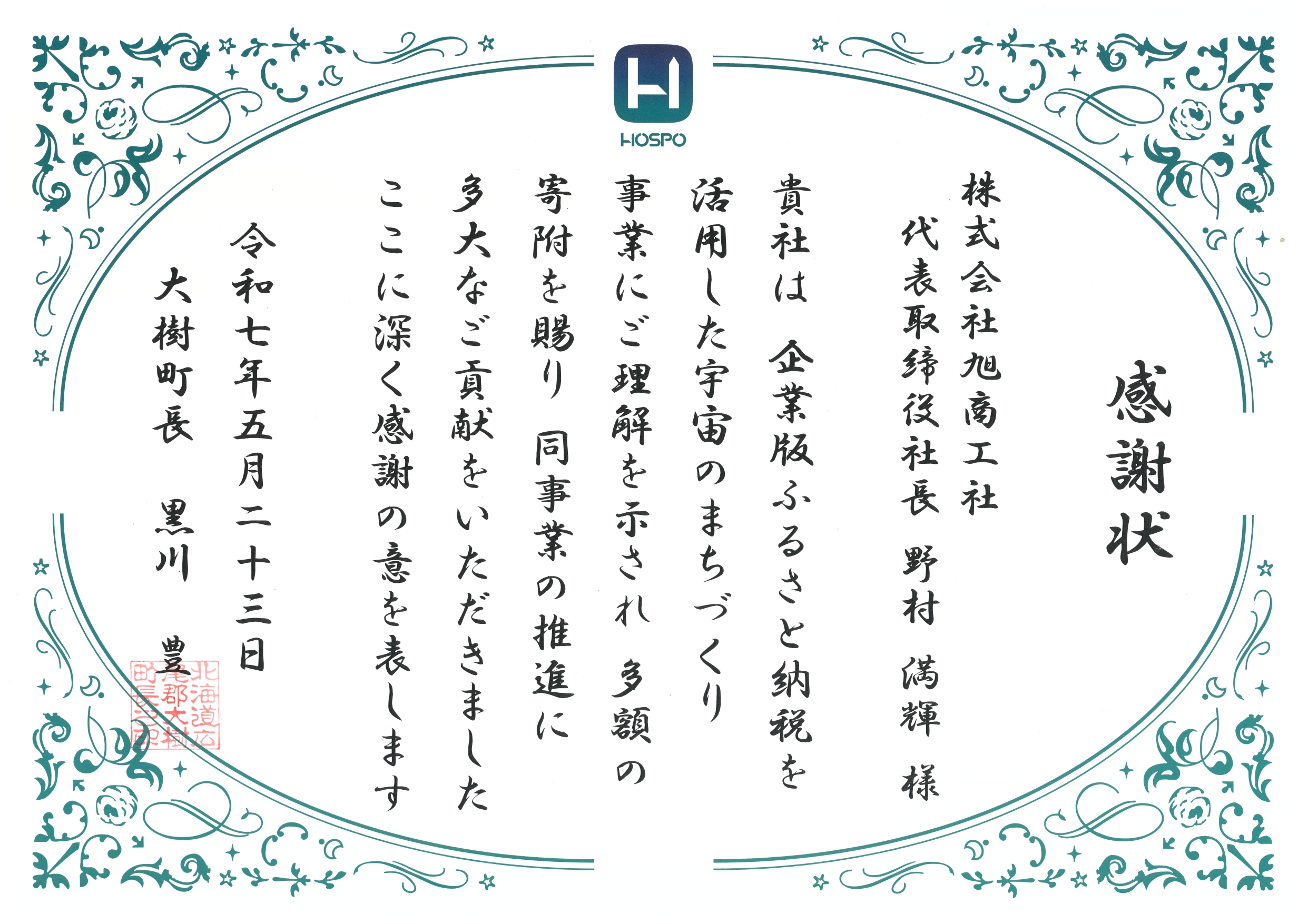 北海道大樹町より感謝状をいただきました